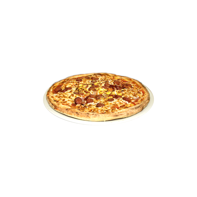 Base tomate aux herbes, mozzarella, jambon, merguez, oeuf